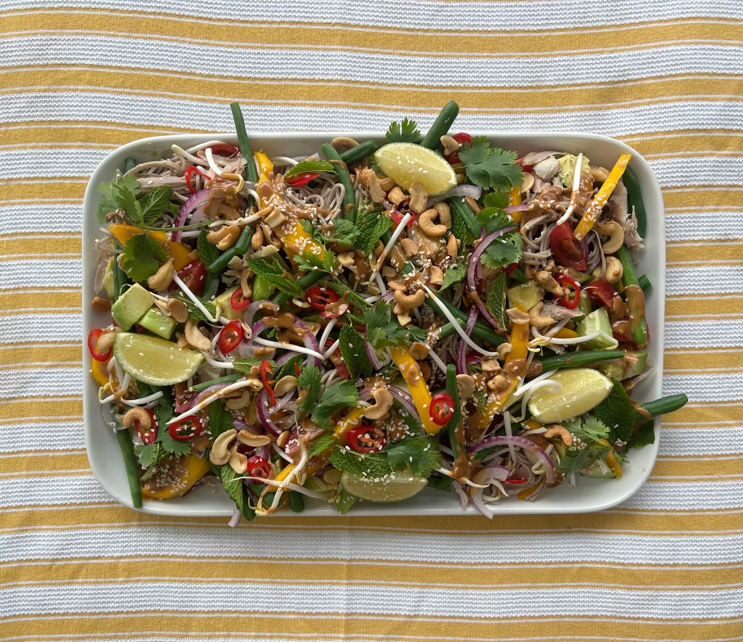 Assemble the salad: In a large platter or bowl, layer the soba noodles, chicken, green beans, avocado, tomatoes, cucumber, red onion, bean sprouts, and mango.